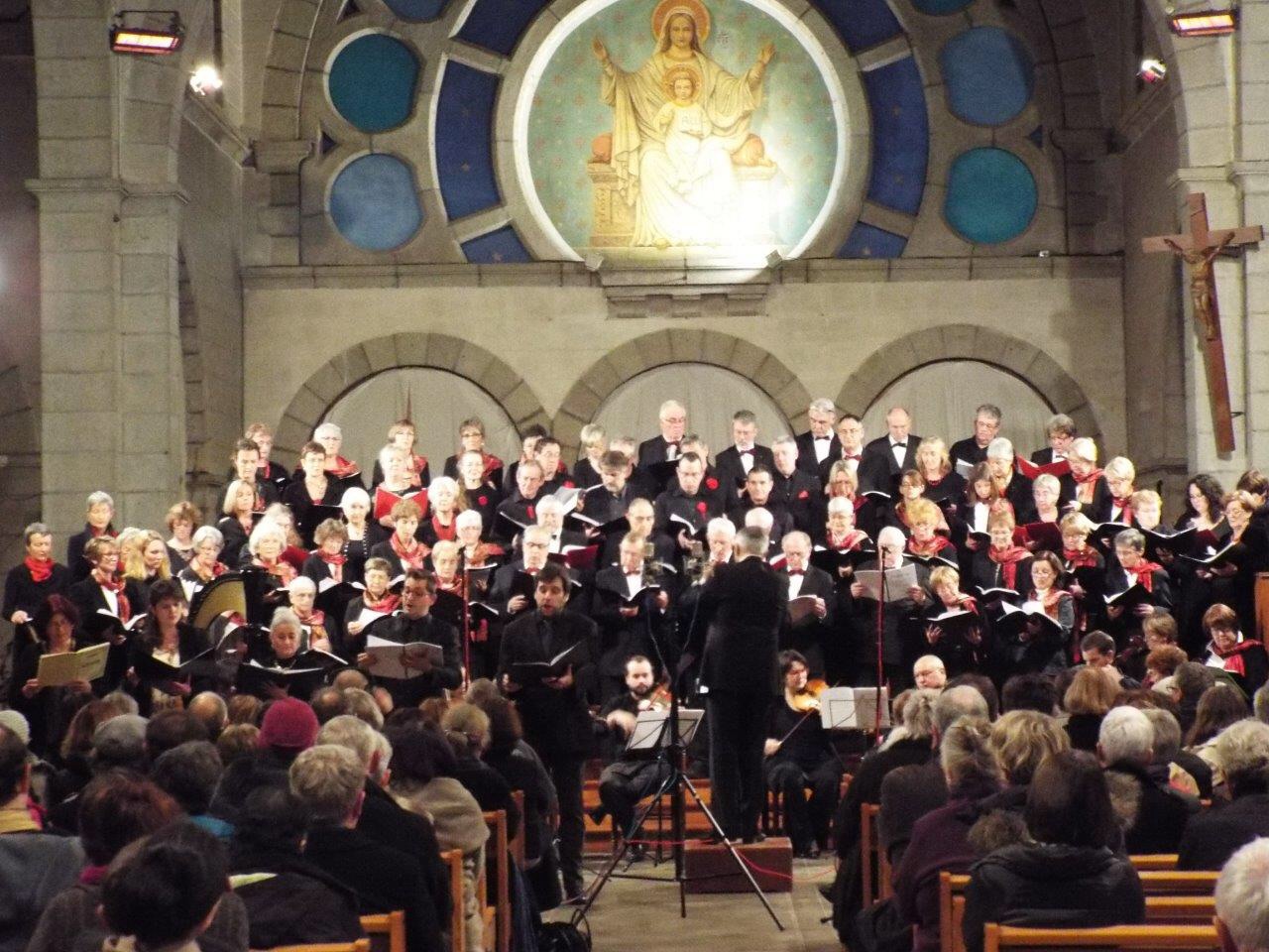 The second part of the concert comprised mainly of The Christmas Oratorio by Camille Saint Saens for which the three choirs were joined by Cantoria, another Breton choir, an orchestra and several professional soloists under the baton of Bruno Bazin. The audience was captivated by the beautiful music of the Parisian composer who died December 16th 1921. The combined forces then performed the Agnus Dei from Misa Europa before raising the roof in a thrilling rendition of Tollite Hostias by Saint Saens under the baton of Graham Williams.