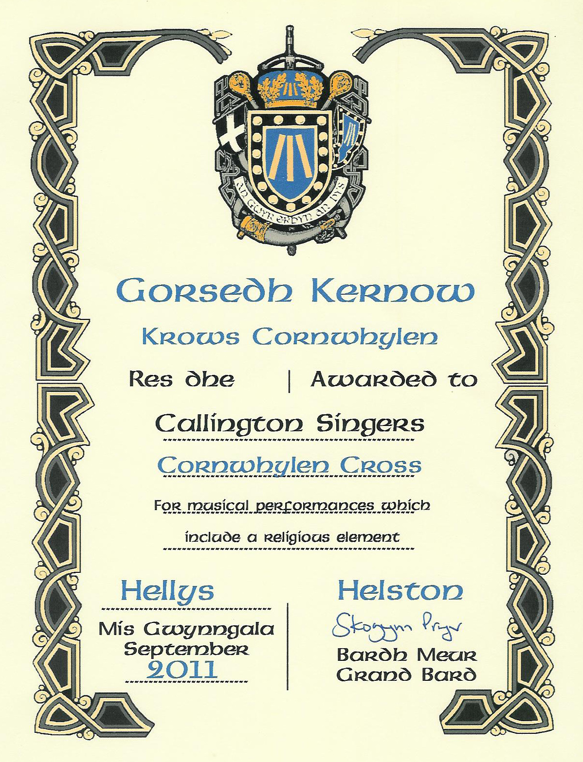 CALLINGTON Singers were honoured to receive an award at the annual Open Gorsedh.